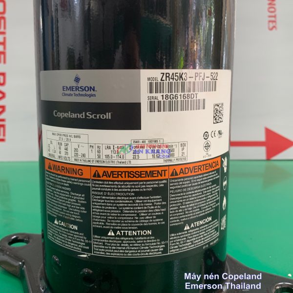 Công Ty AN KHANG chuyên cung cấp máy nén Copeland ZR45KC-TFD-522 Sau những nghiên cứu, cải tiến kỹ thuật không ngừng, Copeland đã thực hiện thành công việc thiết kế và chế tạo máy nén xoắn ốc ZR với số lượng lớn, chất lượng vượt trội mà giá thành rẻ.